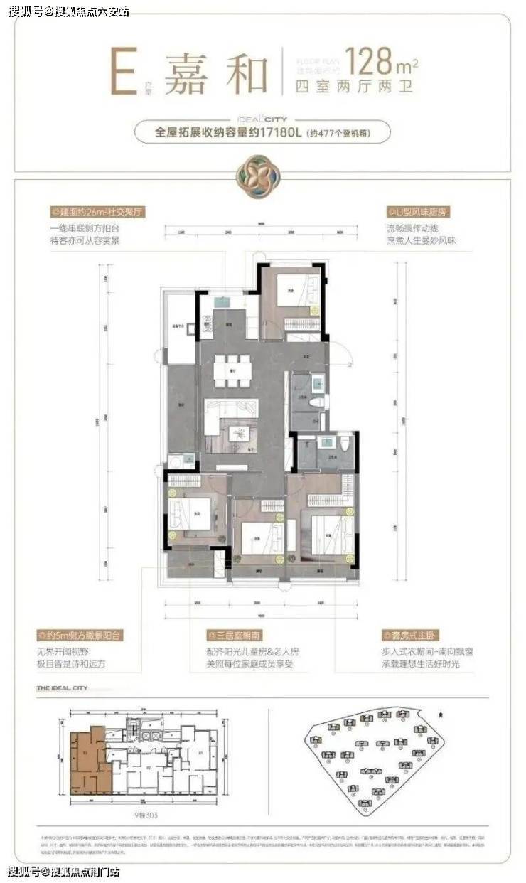 建面约107㎡户型,则把重点放在舒适度上。阔绰方厅+双联阳台,通风赏景至佳,还有U型厨房,三面操作空间,动线流畅好用;套房式主卧更配置了步入式衣帽间,独立卫浴设计,保证了主人家的隐私和仪式感。