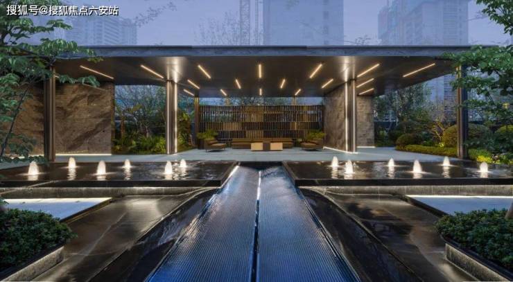 两侧弧形的石材则采用波浪板设计,全部采用定制大板切割。门区弧形结构与中心核心水台交相辉映,营造出门区的庄重仪式感和滨江的磅礴气势,使人沉浸其中,闻声而入。