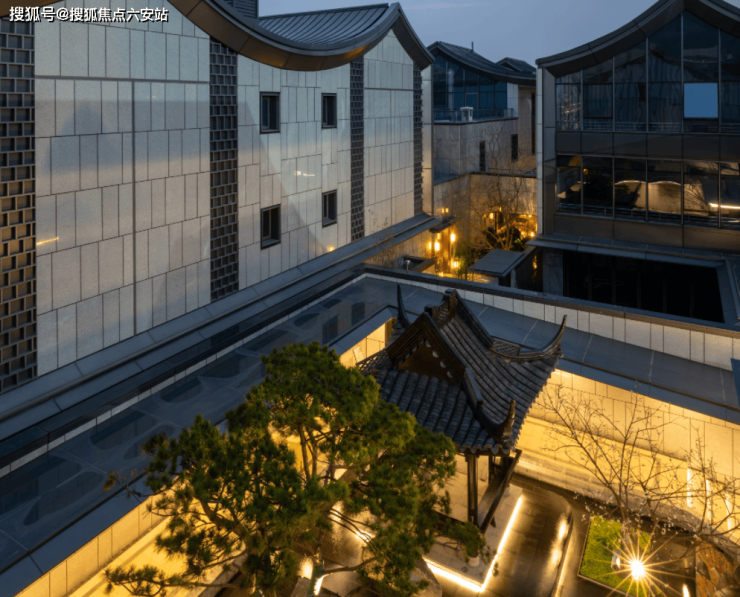 涵雲軒的建筑,吸收江南院落的坡屋顶、山水景墙等中式风骨,同时金属屋面、大面积玻璃幕墙与美国白金石的创新加入,让整个建筑群多了几分国际感。