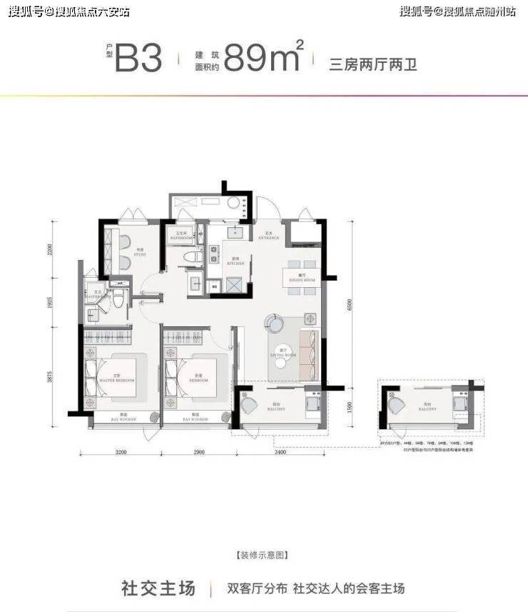 建面约89㎡的三房户型,三开间朝南,设计出了两条平行生活动线,巧妙地形成了一家人共聚的公区,以及由主卧、套卫、书房的“第二客厅”,满足年轻家庭的居住需求。