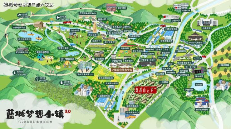 蓝城小镇3.0生活体系涵盖健康颐养(共享健身房、中医理疗)、文化社交(宋韵书院、茶艺雅集)、便捷生活(社区商业街)及度假赋能(星空营地、竹林瑜伽平台),打造自循环生态圈。