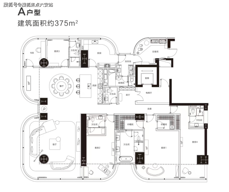 空间革命:通过设备平台改造赠送100㎡,实现六房六卫全套房,南向三套房+双主卧,24米开间客厅直连200㎡美式岛台