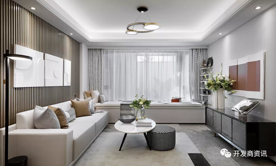 整体采用岩灰系的装修色调,运用门套通高设计、回字形吊顶迭代回光灯带、采用金属踢脚线和仿石材地砖等,让空间美学和质感全面提升。