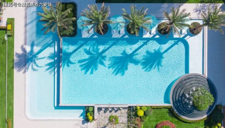 大量的玻璃幕墙+局部铝板等建筑元素的恰当组合,低密的纯洋房大盘在园区中央打造了颠覆性的“六翠之境”:目之所及是一片通透的蒂芙尼蓝,镜面泳池里波光粼粼,倒映着蓝天白云,是真正的“天空之镜”,与边上高大的棕榈树、白色的躺椅、繁茂的绿茵,彼此映衬,海边度假风油然而生。
