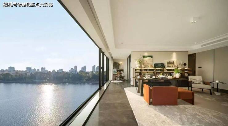 约9.3米超长全景落地窗,像一个画框,把楼下湖水的波光、沿河打造了一条约460米的滨水景观绿堤、远处天际线的轮廓,一并装了进去。