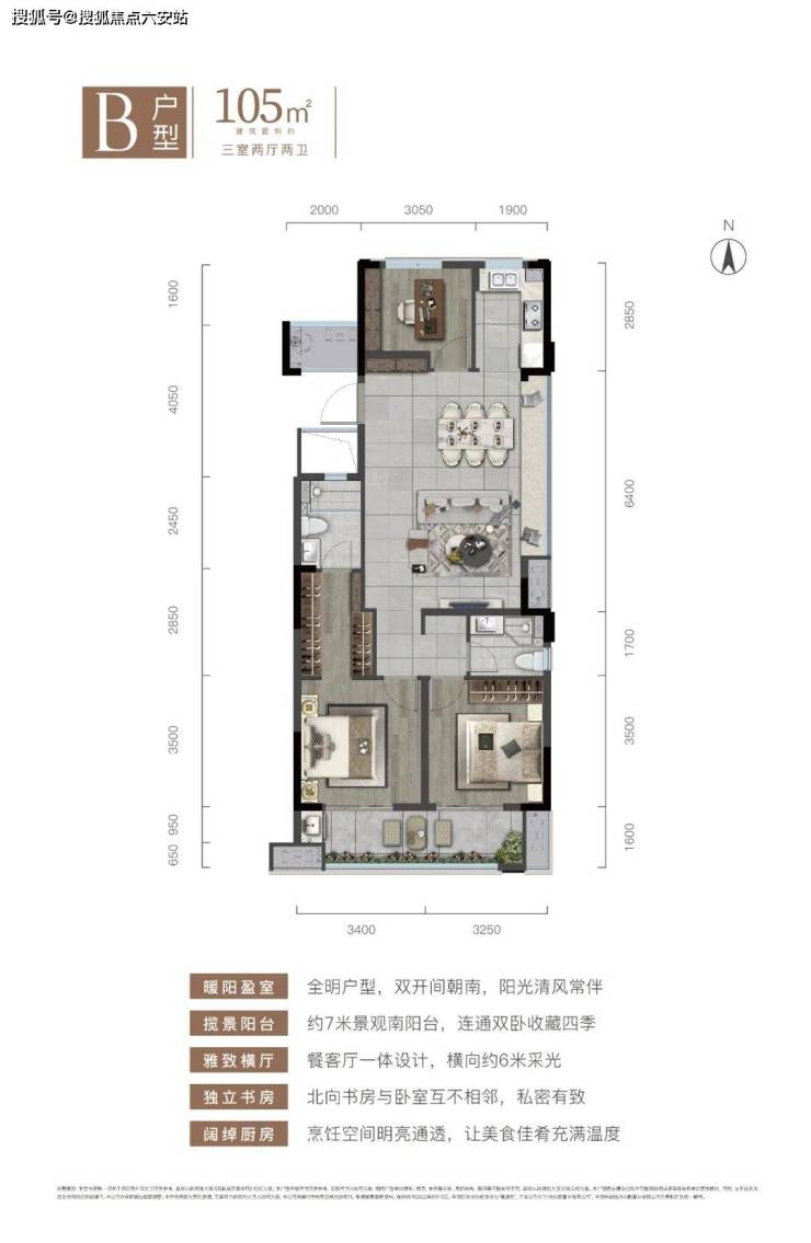 樟源府建筑面积约108㎡户型进阶生活向往,打造兼具实用性与尺度感的北向书房,将三开间朝南的尺度发挥淋漓尽致,串联上南面的观景双阳台,优越的设计让居住舒适度放大的同时,尽揽无限风光。