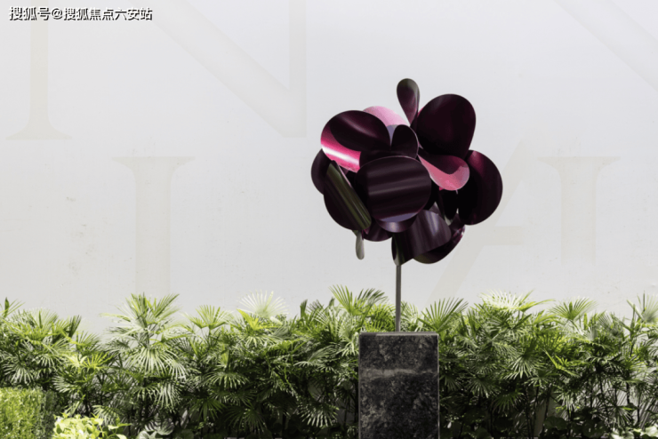 当建筑不再局限于平地,而是顺着台地生长,生活便有了“漂浮”的诗意:山水勾勒如立体剧场,台地步道蜿蜒铺展,“步步向福,阶阶升吉”的寓意藏于其间,转角处,同样出自施海老师之手的《恋紫》雕塑,上下呼应,以流动金属线条,勾勒花瓣舞动之姿。
