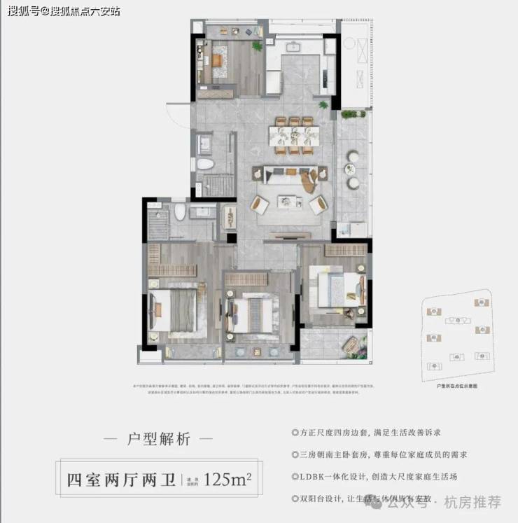 125㎡四房两卫同样是边套:三个卧室均排列在南侧,充分实现了“阳光平权”,每个家庭都可以沐浴在阳光中醒来。LDBK一体化的公区,充分实现了家庭成员间的互动;除了边厅外接的阳台外,南向次卧同样设计了阳台,兼顾了景观和晾晒的需求