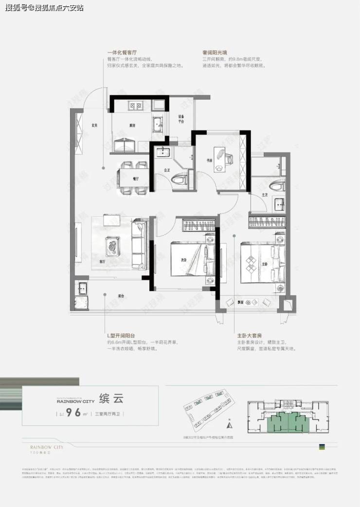 像建面约96㎡户型,整体三开间朝南设计,约9.8m奢阔尺度,户型方正大气,明亮通透,动静分区,再加上约6.6米开阔L型阳台,轻松实现一半洗衣晾晒、一般诗意生活的美妙画境。