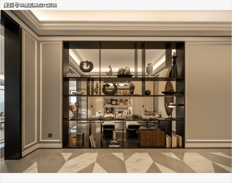 由WSD上海世尊团队执笔,以“摩登东方”设计语言抽象东方写意精神,入户即见约2米宽法式艺术走廊(地面几何拼花石材+白色实木线条),如“小卢浮宫”般安放艺术收藏。转角厅含X空间达约120㎡,可容20人风尚派对,远超南岸480㎡大平层110㎡客厅的常规尺度。