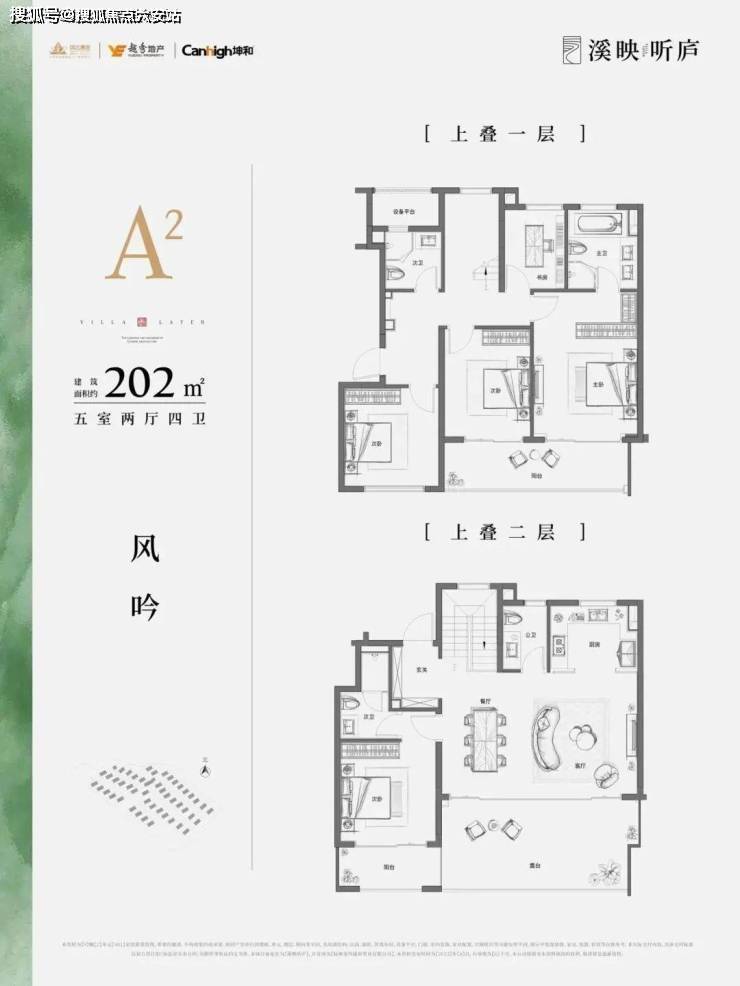 约202㎡上叠,同样是三开间朝南,但是五房四卫,较下叠少一个卫生间。