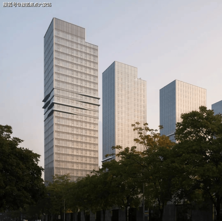 五幢约26-27层的高层建筑,犹如跃动的音符般一字排开,编织出纤细且极具雕塑美感的外轮廓线条,搭配大面积淡蓝色玻璃幕墙与铝板金属线条,营造出气势恢宏的地标感。