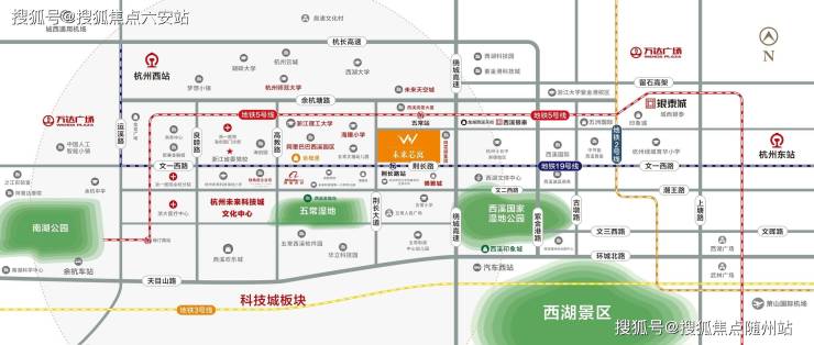 项目距地铁5号线五常站300米、19号线荆长路站300米,双轨交汇实现与城市核心区的快速联通。19号线直达杭州西站与萧山机场,而绕城高速、留石高架等主干道环伺,构建了高效通勤圈。