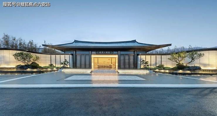 迎面是主入口约59米宽、12米高的新中式大门,九脊歇山顶大气尊贵,两株罗汉松分列左右,一眼望去气势恢宏。