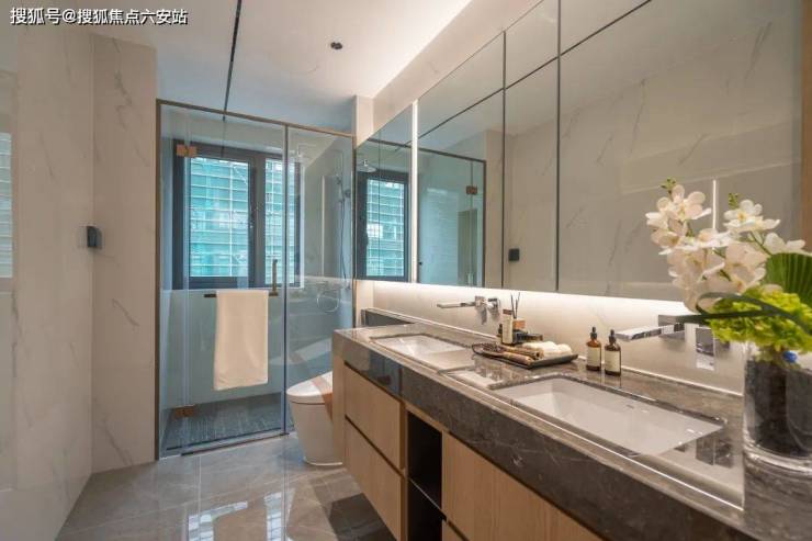 浅色石材基底:搭配金色勾边与大面积玻璃幕墙,融合宋式飞檐、青松格栅等元素,再现东方隐奢意境,比肩江南里、凤起钱潮等顶豪气质。