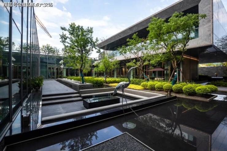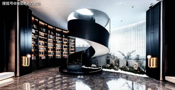 售楼部前场半下沉开放广场,利用高差丰富空间层次,增强室内外联系,同时容纳参观、休憩、聊天、等多元场景,过渡到地下部分,踏步于黑色石英砖,满眼流水景观和立体绿植,庭院、小径营造出静谧的舒适感。