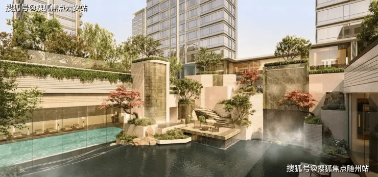 “一轴七岛十一境”社区景观 项目内打造镜面水景、叠瀑、悬浮绿洲、环形步道等11处主题节点