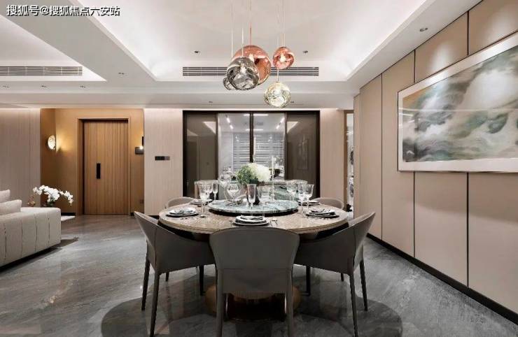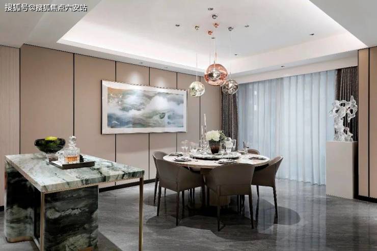 方正的餐厅,放下一张大圆桌的同时,还布置了时下非常流行且实用的“空间中岛”,以后用来做酒吧台、早餐台,都非常方便。一边备菜做饭,一边布置餐桌,非常有画面感!