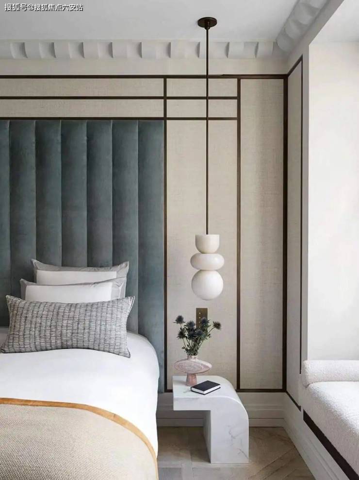 三个卧室都朝南,做了三套房,推开双开门进入主卧,背景墙是蓝绿米黄的墙布和皮革软包,折叠门拉在一边,是一个内包阳台,坐在软榻上看窗外的城隍阁,山峦供白云以家乡,使之倦游而归息。家,不就是让人彻底放松下来的庇护所吗?