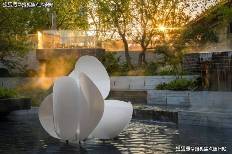 当建筑不再局限于平地,而是顺着台地生长,生活便有了“漂浮”的诗意:山水勾勒如立体剧场,台地步道蜿蜒铺展,“步步向福,阶阶升吉”的寓意藏于其间,转角处,同样出自施海老师之手的《恋紫》雕塑,上下呼应,以流动金属线条,勾勒花瓣舞动之姿。