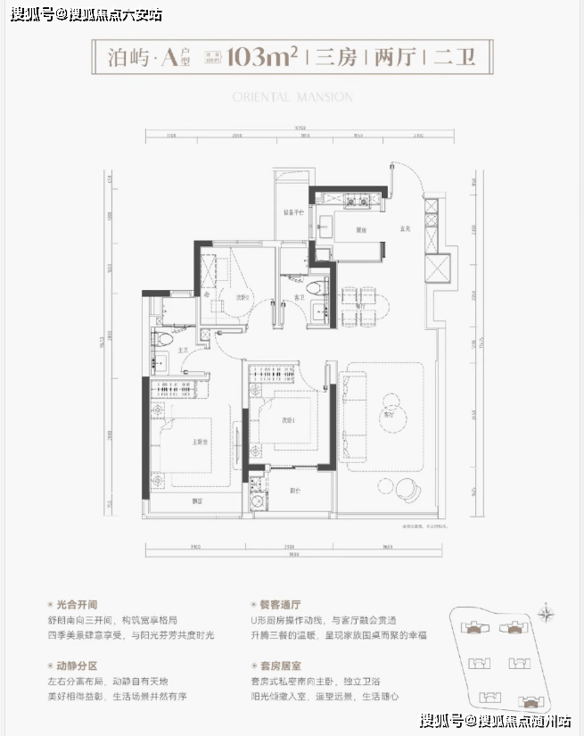建面约103平,三房两厅两卫。三大亮点分析:① 南向三开间,朝南次卧带阳台,客厅联通阳台后,空间阔绰;② U型厨房且半开放设计,玄关含S墙冰箱位,利用率高、采光更优;③ 新规户型得房率高达约90%以上。