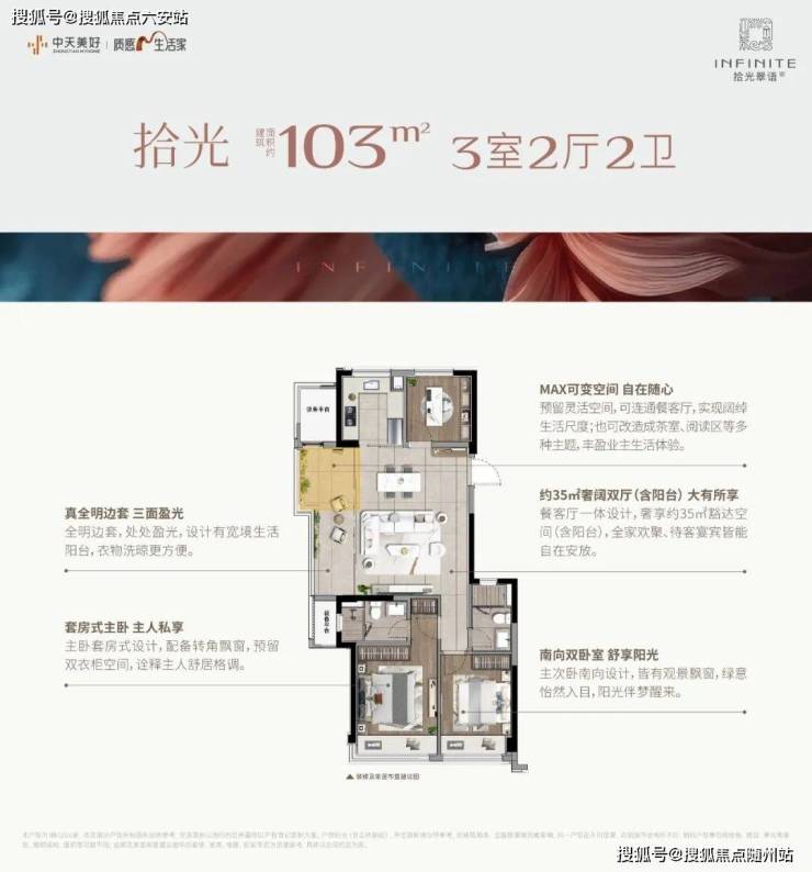 建面约103㎡的边套更是堪称神迹,将小户型的空间魔法玩到了极致。客厅到阳台的地面、天花直接拉通,甚至两侧的墙垛都已隐身,整个餐客厅面积达到约35㎡(含阳台),这可是140㎡以上大宅才有的空间感!