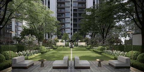 外揽城市公园、滨水景观带,迎合地缘优势,让景色融入归家之旅;内拥约 700㎡ 镜面水院与近 200㎡自然动态水系,如同灵动的缎带,串联起九座主题花园,共同编织出“林汐九境”的立体画卷。镜水映天光,叠溪奏清韵,从摩尔花园的自然廊架到罗曼花园的庄园谧境,归家之路宛若穿行森林艺术馆,建筑在潺潺水声中生长出盎然诗意。