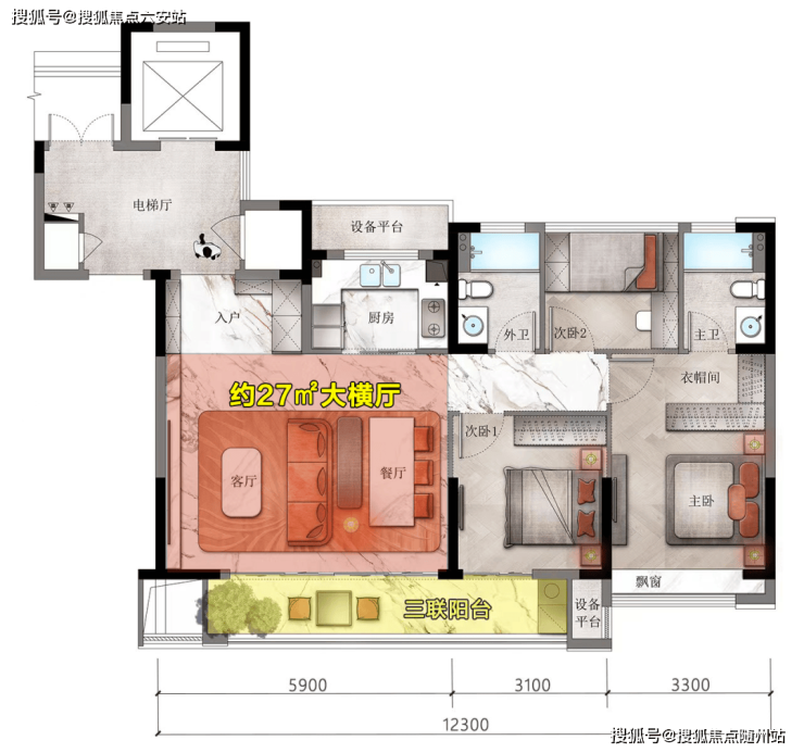 尤为惊喜的是,餐客厅外接一个约9米宽的“三联阳台”,与次卧相连,采光面感人。