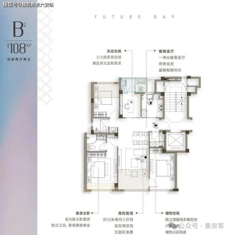 全能收纳王入户标配储藏间,同时三个卧室均预留了衣柜区。108方户型布局差不多,但北面多一个房间。