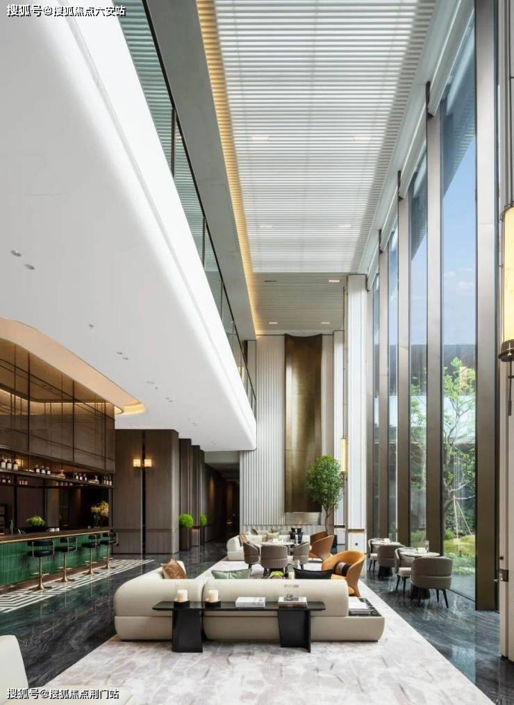 挑高区域采用了长达约10米的落地玻璃窗,整体营造了一个被园林美景包围的城市会客区。