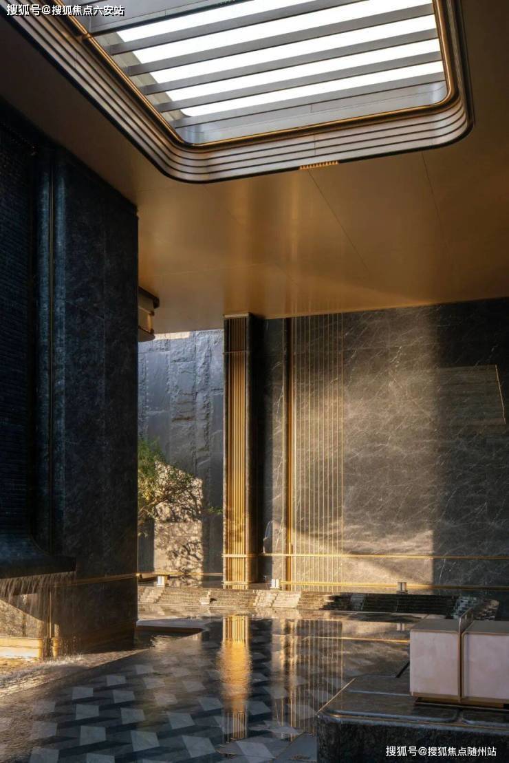 纤薄的金色铝板华盖自中央开启一方天井,由白雪公主奢石拼合成一顶华冠,映照入口庭院空间。由老石皮奢石砌筑而成的景墙斑驳嶙峋,与深色水池承托的洁白雕塑对望而立,在时间的影像里叙述着人工与天然的微妙联系。
