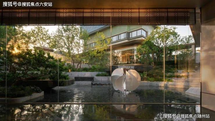 穿过铜门,进入接待大厅,透过一片落地玻璃窗,一幅园林画卷徐徐展开——叠水佳石、立体游廊,曲折尽致,颇具园林逸趣。