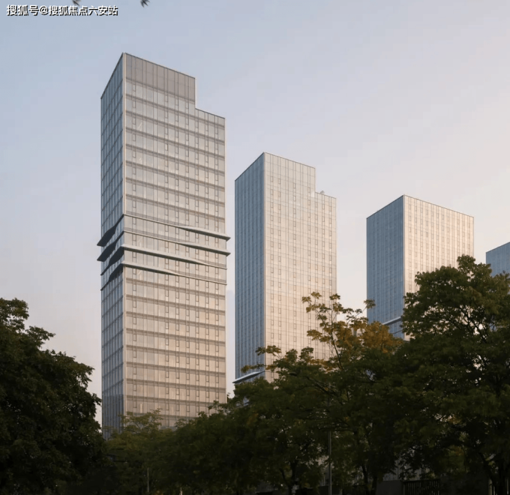 五幢约26-27层的高层建筑,犹如跃动的音符般一字排开,编织出纤细且极具雕塑美感的外轮廓线条,搭配大面积淡蓝色玻璃幕墙与铝板金属线条,营造出气势恢宏的地标感。