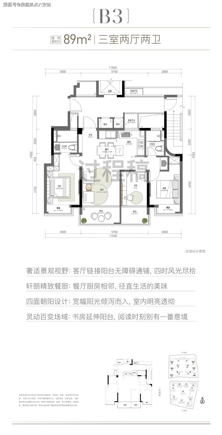【杭州为数不多89方神户型】市场爆款建筑面积约89m²神户型,四开间朝南、约11.5米南向面宽、约18.5m²豪华主卧,三室两厅两卫格局,91%高得房率,舒适度堪比100方空间。