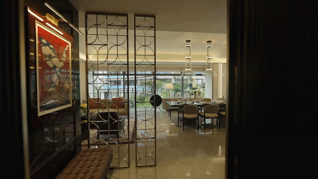 该户型由GFD广飞设计事务所创始人叶飞老师设计,共有五个套房+三个厅(两个小厅+一个餐客双厅)且带保姆房、司机休息室及300方私家屋顶花园。整体的空间是以“西形东意”为设计核心的空间美学,以现代的设计手法呈现东方的人文底蕴,呈现集东西家居文化之大成。