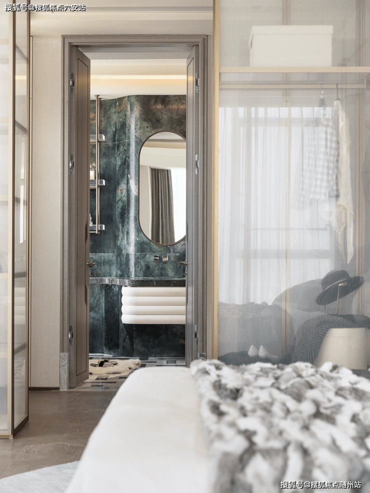凯旋门位于玄关右侧,材质与核心筒呼应,清晰区分公区与私领域,空间在有序中灵动交织。这种设计既保障了私密空间的隐蔽性,又确保了公共区域的开阔性,实现了动静分离的理想布局。