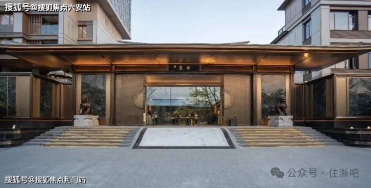 采用“王府中式”设计,大门为歇山顶形制(宽53米、高近11米),配黄铜狮、罗汉松及蓝翡翠奢石。园林融入西湖十景元素,如“花港观鱼”水景、“柳浪闻莺”绿植,并设雾森系统首层单元门厅石材铺就,肌理沉稳。