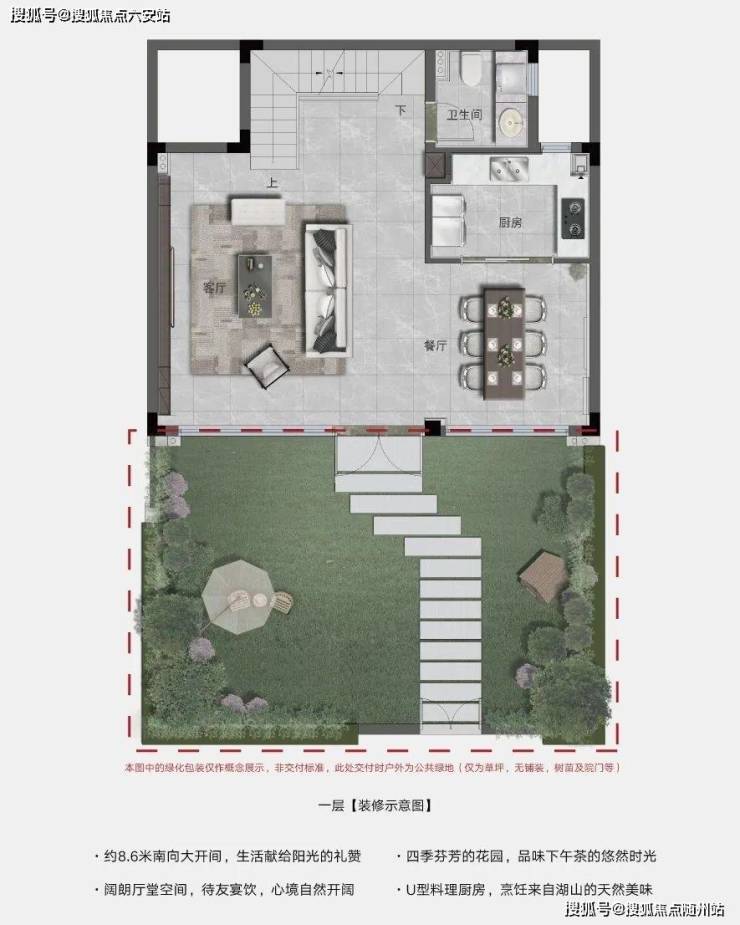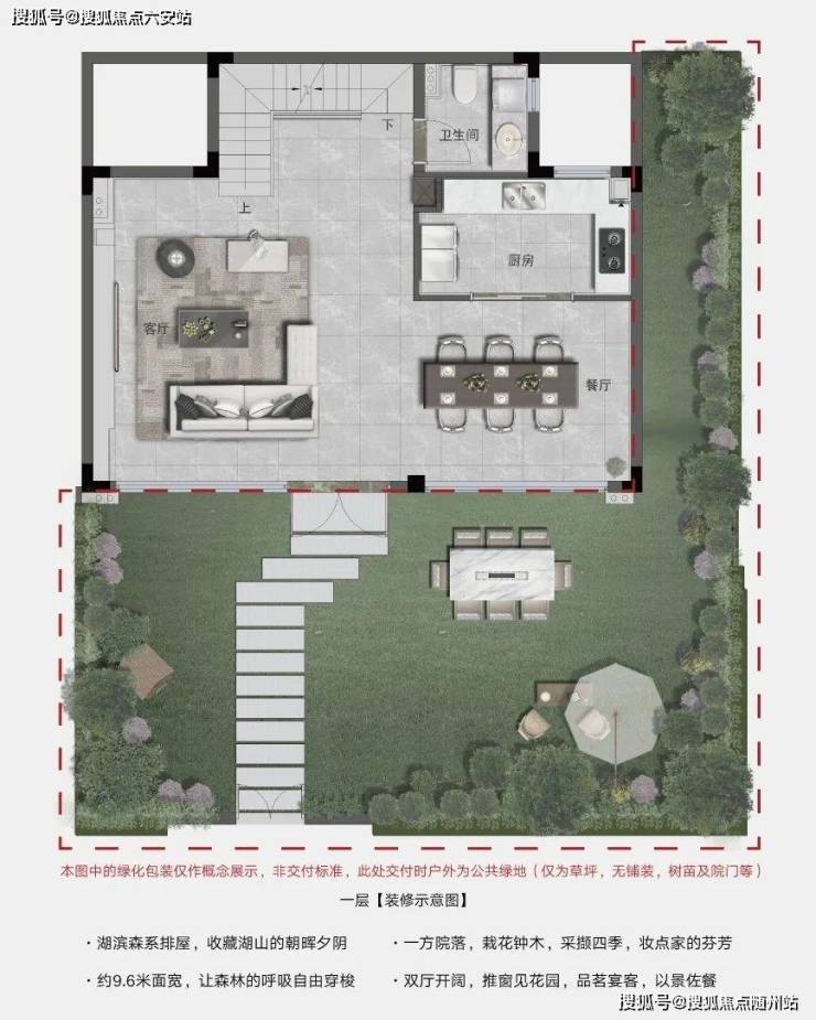 一楼餐客厅开间约 9.6 米,进深约 7.5米,闲谈、聚会、游戏等各种场景随心切换。