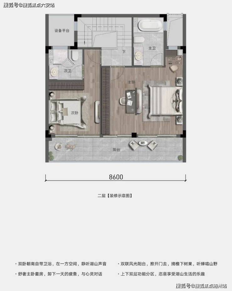 一层是餐客厅、厨房、卫生间,二层为朝南双卧套房设计,除了卫浴外,还外带南向双联阳台。