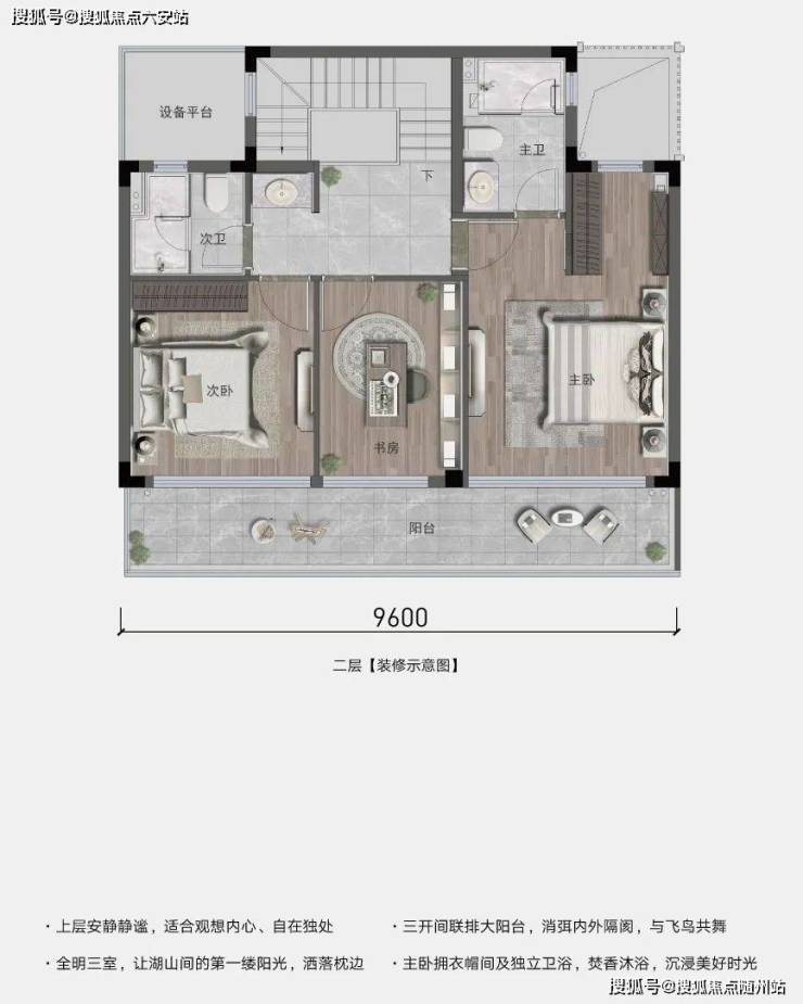 二楼为私人生活区,设计有 2 个套房卧室和 1 个书房。