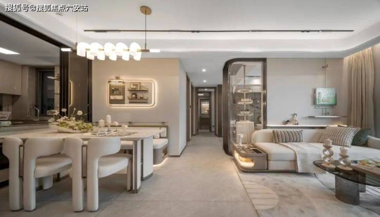 建筑立面:采用“金框超流体”设计,鎏金线条勾勒银色铝板,搭配大面积曲面玻璃,顶部弧形塔冠与270°曲面玻璃实现高窗墙比,呈现现代摩登美学。