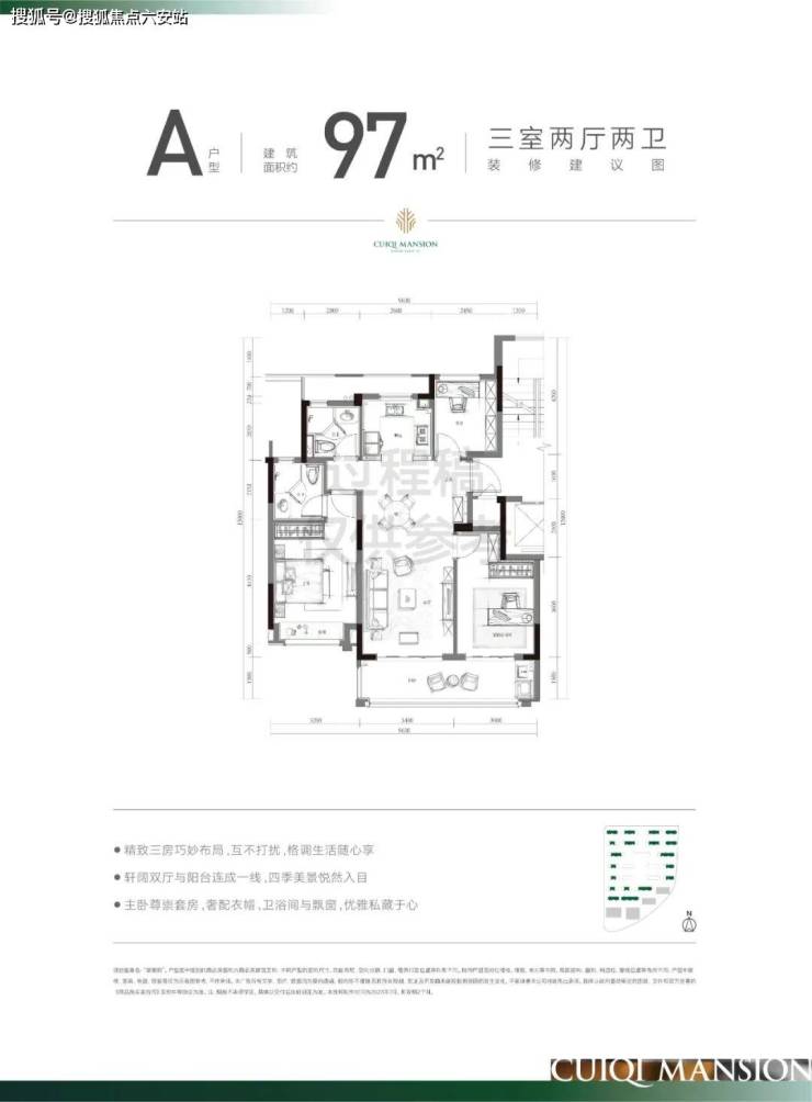 97㎡三房两卫:三开间朝南+双面采光阳台,主卧套房设计,小户型亦显阔绰。