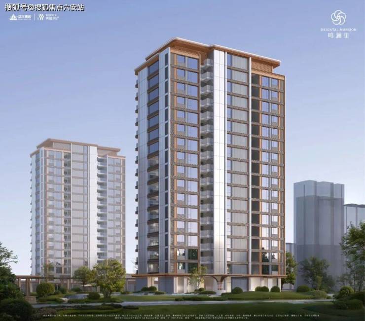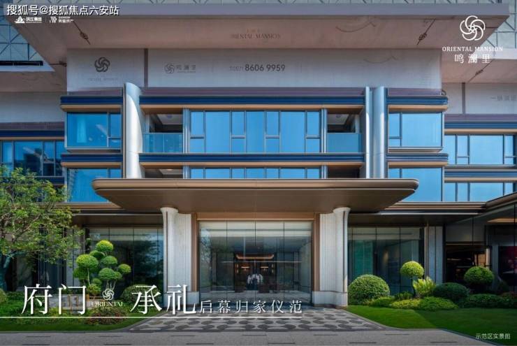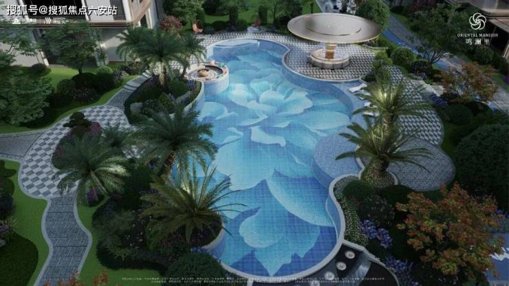 门前两棵罗汉松;园区内的中央园林围绕新型蓝宝石戏水池打造,营造澜韵迎宾、松鸣涧语、鸣泉叠韵、鸣芳拾趣、鸣香径幽等九境空间。