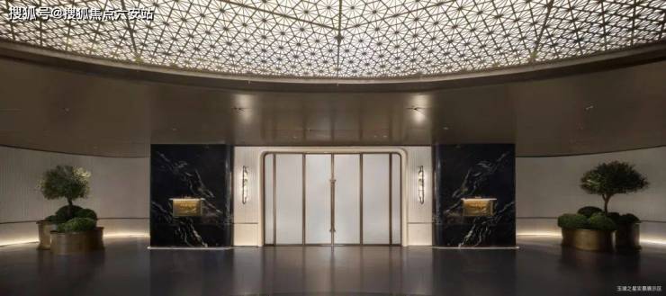 水为脉,玉为魂,镜面水庭倒映建筑弧线 ,约5.5米挑高长廊串联「收放式空间叙事」。贝金米黄石材+古铜大门