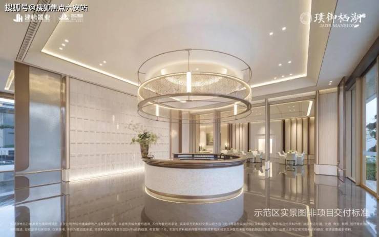 回廊、水景、庭院、绿植,公区的设计也跟门头一样大气。售楼处里随处可见各式各样的吊顶,架空层的雕花隔断、金属格栅......很难想象这是单价“2”字头的项目。