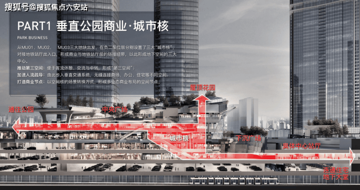 垂直公园商业理念。项目自带约7万方Shopping Mall,与百万方地下商业联通,通过「脉动绿丘」景观概念,将奥体公园绿色生态盘旋引入,打造购物、观赛、遛娃、健身的无界生活场。
