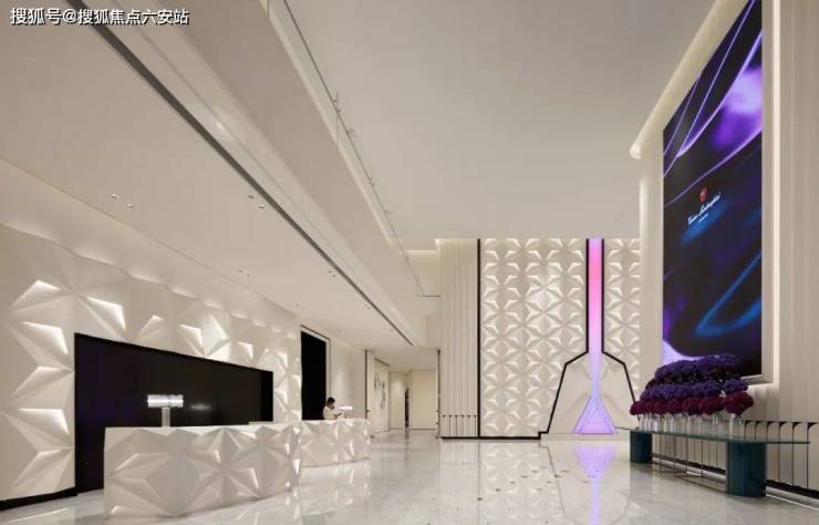 步入挑高约11米的一楼大堂,折线通高墙面与钻石切割前台 ,像极了兰博基尼发动机的散热鳍。