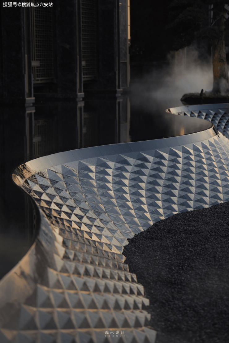 门前格栅雅致,光影错落间,叠水正潺潺流动。龙鳞水景以整石精工打造,每一块石材皆经匠人悉心雕琢,形态仿似神龙于云间翱翔,龙身蜿蜒舒展,龙爪若隐若现,似在云霭里腾挪辗转。