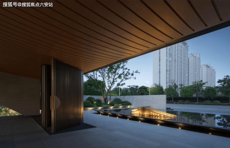 根据对室外景观的需求,墙窗组合自由,仿石涂料、铝合金与大玻璃幕墙组合,以铝板和瓦楞板取代木饰面肌理,保留中式形制传统韵味的同时,外部整体呈现出优雅高端的当代美学。