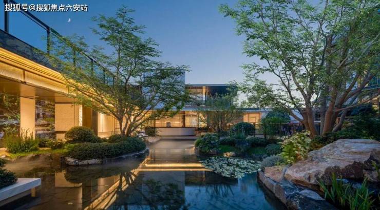 以水、风雨连廊、空中悬挑平台串联山水相依风雅景致 , 呈现三层立体园林及 约15 米飞石叠瀑景观,营造出丰富的空间层次感,中央布置大面积立体水景,如诗如画。
